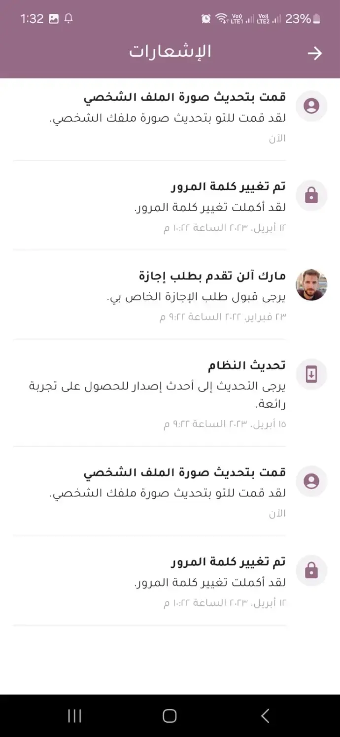يبقيك على اطلاع بكل تحديث على حسابك الوظيفي: تغيير كلمة المرور، تحديث الصورة، طلبات الإجازة... مع تفاصيل دقيقة وتنسيق سهل القراءة.