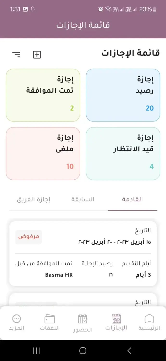 قدّم طلب نفقات مثل السفر أو المستلزمات المكتبية، وأرفق الفواتير وتابع حالة الطلبات (مقبول – معلق – مرفوض).