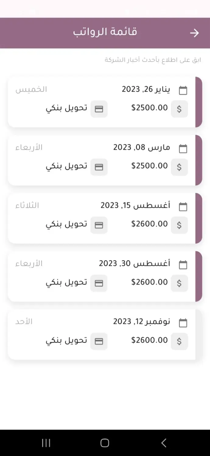 اطلع على كافة تفاصيل الرواتب المحولة شهريًا، بما في ذلك التاريخ، المبلغ، وطريقة التحويل البنكي.
